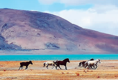Peku Co Тибетт??(Xizang)?аласында орналас?ан. Ол Эверест ?оры? ???р?ндег? е? ?лкен ?шк? к?л. Фотода к?л бойында шауып ж?рген Мустангтер.