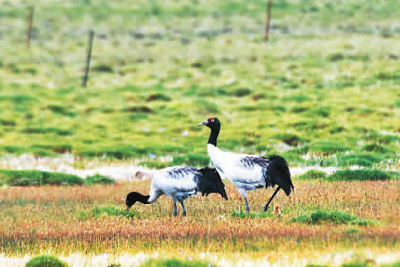 Цилиан тауы мемлекетт?к парк?н?? к?нд?г?нде орналас?ан Цинхай ?лкес?ндег? Ианлон сазды?ы таби?и ?оры? ???р?. Ж?птас?ан ?ара мойын тырналар ек? балапан басып шы?арды.