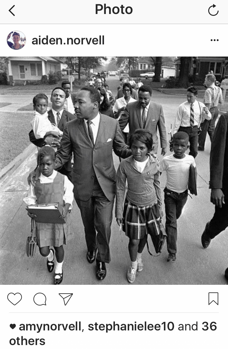 In April of 1963, twelve years before I was born, Dr. King wrote me a letter. That is to say he wrote a letter to white moderates and white clergy who either opposed the movement or were uncertain about how to respond to it and to him. He wrote that letter from jail to (mostly) white men who would offer theoretical support for civil rights but criticize King’s assertive, entirely non-violent means of working for those rights to become reality. Every time I read the letter, I see myself in it. I see myself in the white moderates he addresses who did not like hate or oppression but who lacked the understanding and sometimes courage to support the movement to undo them. I see myself in King’s hope for a better day and better way, and I pray I’ll have insight and guts to be a small part of bringing those to pass. I pray I’ll believe that this part of God’s Kingdom coming on earth is more important than comfort or money or familiarity and that my kids will believe that more than I do.